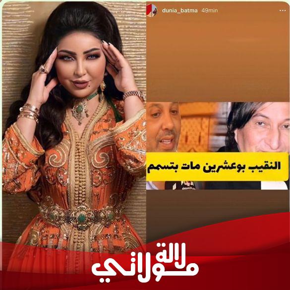 قامت الفنانة المغربية دنيا بطمة بتفجير مفاجأة بخصوص سبب وفاة محاميها النقيب عبد اللطيف بوعشرين، حيث أفادت أن هذا الأخير توفي بسبب تعرضه للتسمم.