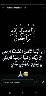 وحرصت الممثلة، فاطمة الزهراء بلدي على تقديم واجب العزاء لزميلتها صلاح الدين، عبر تدوينة على حسابها الشخصي بـ “الإنستغرام”.