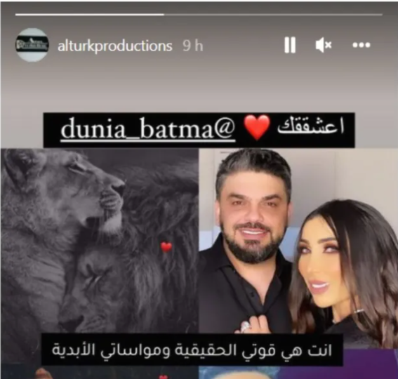 واختار الترك خاصية الستوري عبر الحساب الخاص بشركته للإنتاج على “الأنستغرام”، من أجل تهنئة زوجته بهذه المناسبة، إذ عمد إلى نشر مجموعة من الصور التي جمعته بزوجته، وقابلها بصور رومانسية جمعت أسدا ولبوءة، أرفقها بتعليق جاء فيه ” أعشقك دنيا بطمة أنت هي قوتي الحقيقية ومواساتي الأبدية عيد امرأة سعيد ملكتي”.