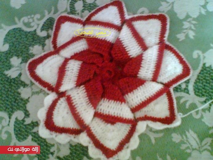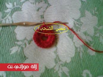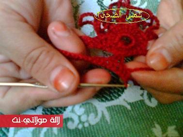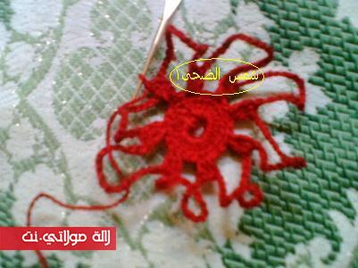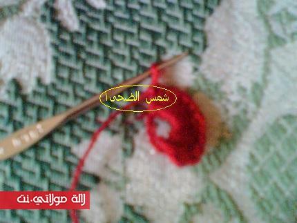 المرحلة السادسة: ننسج بلون مختلف بنصف غرزة لشد الوردة ،بعد نهاية الدائرة ننسج 9 غرز في واحدة ،ثم غرزة في السلسلة ،ثم نصف غرزة ثم غرزة في سلسلة وهكذا حتى ننتهي النسج .