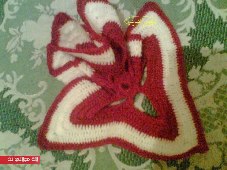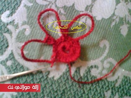 المرحلة الرابعة: ننسج الغرز العشر الأولى التي في السلسلةبعدها ننسج الغرزة 11-4 غرز في واحدة. ثم نتمم النسج مع زيادة غرزتين للغرزة الوسطى في السطور الثلاث الاولى لنجد في السطر الاول 4 ثم 6 ثم8.