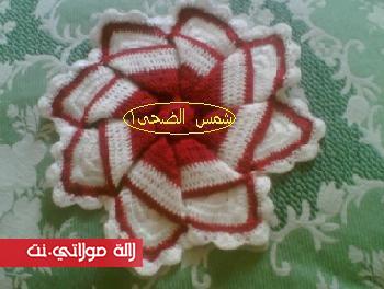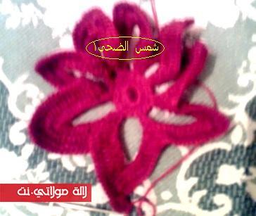 المرحلة الخامسة: نغير لون الخيط وننسج 3 أسطر مع إضافة 8غرز في الوسط كل سطر ،ثم نغير لون الخيطن وننسج سطرا واحدا وهكذا نلاحظ تشكل الوردة عندنا: