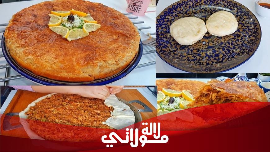 من مطبخ تيما / المكونات : 500 غرام دقيق أبيض ملح ماء توضيح الكمية في الفيديو مكونات الحشوة: 3حبة كبيرة بصل نصف كأس زيت مخلوط ما بين زيت المائدة وزيت الزيتون توابل: ملح فلفل أسود زنجبيل وفلفل أحمر وحار 4 ملاعق كبيرة بقدونس ربع كأس صلصة الصوجا 1 ملعقة صلصة الحار 6فصوص ثوم صدر دجاج مع الأفخاد جبن اختياري مخلل الليمون عصير حامضة زيتون وفطر معلب اختياري زبدة وزيت لتوريق.