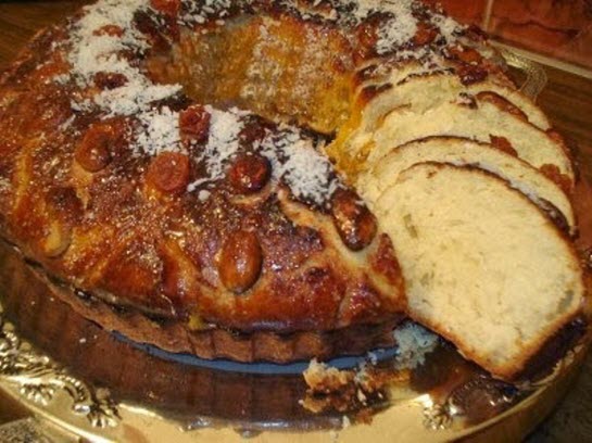 7. بعد أن يطهى البريوش نتركه حتى يبرد قليلا ثم ندهنه بالقليل من العسل و نرش عليه جوز الهند