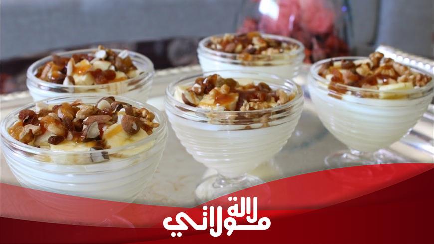 المكونات لتر حليب 4ملاعق نشا فانيلا 4 ملاعق سكر او اكثر حسب الذوق علبة ياغورت 110 غ طبيعي او بالسكر التزيين حسب الرغبة.