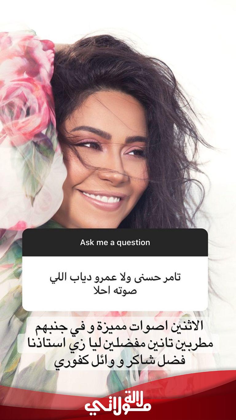 وكشفت الفنانة المصرية عن رأيها في عمرو دياب وتامر حسني وقالت: “الاتنين أصوات مميزة، وفي جنبهم مطربين تانيين مفضلين ليا زي أستاذنا فضل شاكر ووائل كفوري”.