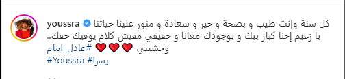 وكتبت يسرا رسالة على الفيديو إلى الفنان الكبير عادل إمام بمناسبة عيد ميلاده الذي يوافق 17 ماي، قائلة: “كل سنة وإنت طيب وبصحة وخير وسعادة ومنور علينا حياتنا يازعيم إحنا كبار بيك وبوجودك معانا وحقيقي مفيش كلام يوفيك حقك…وحشتني.”