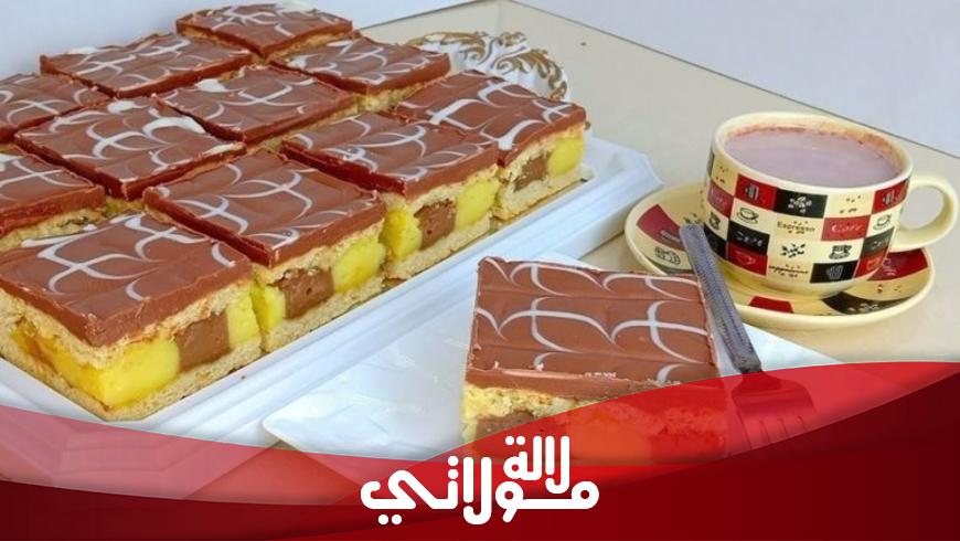 المكونات : 2 بيضات 300 غ دقيق 100 غ زبدة دائبة 75 غ سكر 8 غ خميرة الحلويات 15 غ فانيلا رشة ملح للكريما: 1 لتر من الحليب 5 ملاعق كبيرة سكر 5 ملاعق كبيرة بودرة كريم باتسيير او الكاسترد 50 غ شوكولا سوداء 1 ملعقة صغيرة شوكولا للدهن.