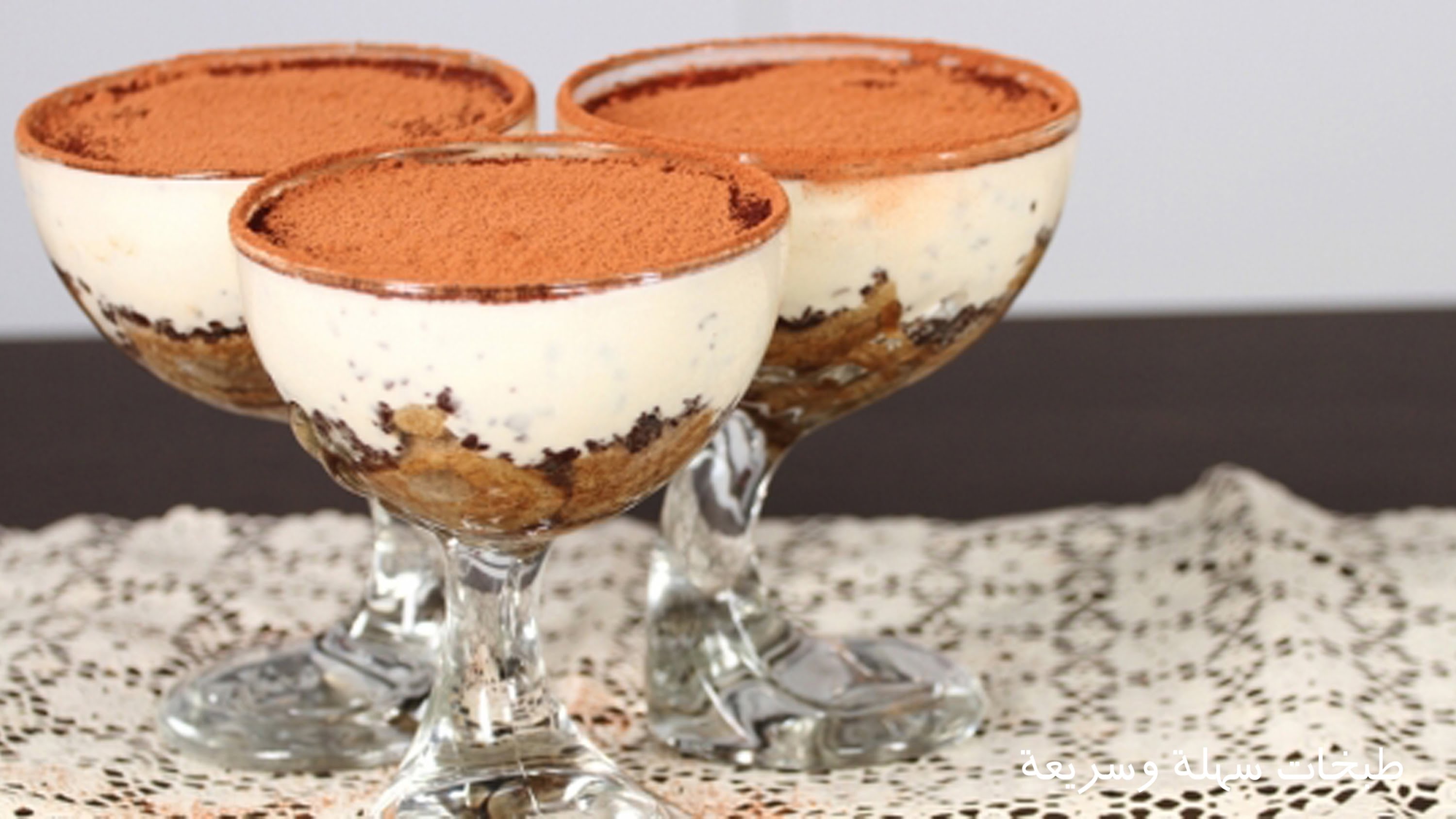 ناخد مول زجاجي للتقديم او كؤوس زجاجية و نقوم بترصيص قطع البسكوي في قعر الكأس بعد غطسه في القهوه سريهة الدوبان مدابة في ماء ساخن و نطربو بخلاط كهربائي جبن الكيري مع الياغورت حتى تصبح لدينا قشدة نصب منها فوق البسكوي و ندخلها الثلاجة تبرد بعدها نرش الكاكاو وتزين حسب الرغبة او يمكن تقديمها بدون تزيين فقط بالكاكاو يمكن ايضا اضافة اكتر من طبقة انا استخدمت طبقة واحدة كل من البسكوي و قشدة الكيري و الياغورت