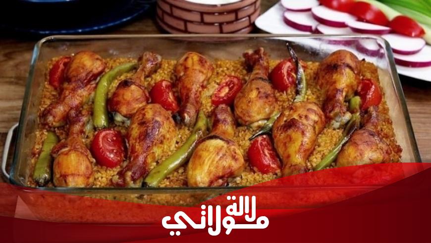 من مطبخ سفيرة الطبخ أم انوار / المكونات 2 ملعقة كبيرة زيت 1 بصلة مفرومة ناعم 1 كيلو دجاج 1 ونصف لتر ماء بهارات عطرية ملح وفلفل 1 ونصف ملعقة كبيرة زيت 1 ونصف ملعقة كبيرة زبدة 1 بصلة مفرومة ناعم 1 ملعقة صغيرة ملح نصف ملعقة صغيرة فلفل اسود 1 ملعقة صغيرة كمون 1 ملعقة صغيرة ثوم باودر 1 ونصف ملعقة كبيرة معجون طماطم 2 ونصف كوب برغل خشن طماطم وفلفل للوجه خليط التلميع 1 ملعقة صغيرة زبادي 1 ملعقة صغيرة معجون طماطم 1 ملعقة كبيرة زيت 1 ملعقة صغيرة بابريكا الملاحظات ننقع البرغل بعد غسلة جيدا مدة 10دقائق ثم نصفيه نسلق الدجاج 15 دقيقة نطهي الصينية في الفرن على حرارة 190 من 25 الى 30 دقيقة ممكن نبدل البرغل بالارز او لسان العصفور او الفريكة.