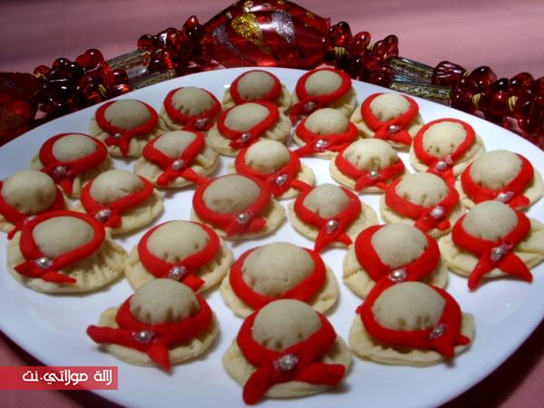 نخلط الزبدة والسكر نضيف القشدة وماء الزهر نضيف الدقيق شوي شوي لغاية ما نحصل على عجينة رطبة نأخد شوي من العجينة ونعملها ملون و نبسطها ونقطعها بسكين خطوط صغيرة نأخد العجينة العادية ونبسطها ونقطعها بنرشم مدور زي القرص قطعتين مثل بعض نأخد كورة اللوز ونوضعها وسط قرص العجين ونغطيه بالقرص التاني ونضغط على الجوانب ونزوقو بنقاش زي الشكل الي في الصورة ونأخد خط من خطوط العجينة الحمرة ونلفو على القرص ونثبتو بعقيقة ونخلص نفس العملية للباقي ونرتبهم في صفيحة مدهونة وندخلوهم في الفرن