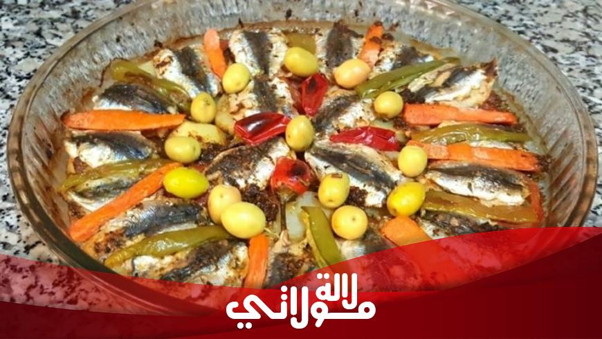 طريقة التحضير تُغسل الخضراوات، وتُقطع بصورة حلقات دائرية غليظة باستثناء الفلفل الأخضر الحار والكرفس. يُفتح السردين من المنتصف، ويُنظف جيدًا. تُحضر الشرمولة عن طريق خلط كافة المكونات معًا. يُدهن السردين من الخارج والداخل بالشرمولة. يُدهن الطاجين بزيت الزيتون. توضع نصف كمية السردين داخل الطاجين. تُضاف الخضار باستثناء الليمون، ثم يُضاف ما تبقى من السردين، يليه الليمون، وما تبقى من الشرمولة، والفلفل الحار، ثم يُضاف الماء، ويُغطى الطاجين. يُدخل الطاجين إلى الفرن، ويُترك مدة خمس وأربعين دقيقة، ثم يُقدم.