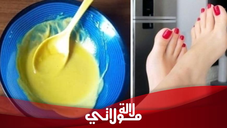 طريقة التحضير:نخلط عصير الليمون مع الكركم، ونحركه جيداً حتى نحصل على مزيج متجانس. نضع المزيج على القدمين، ونتركه لمدة نصف ساعة، ثمّ نغسلهما بالماء الفاتر، ونكرر استخدام هذه الوصفة مرتين كل أسبوع.