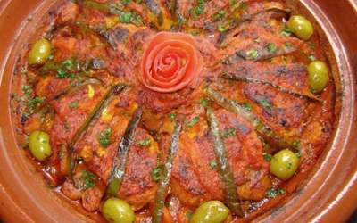 في إناء نخلط جميع المكونات المذكورة للشرمولة ثم نمرر فيها قطع السمك ونحتفظ بها جانبا. في الطاجين نضع حلقات البصل كطبقة أولى ثم الجزر ثم السمك. نخلط شرمولة بالماء ونضيف صلصة الطماطم ونصب فوق السمك مع الاحتفاظ بالقليل. وفي الأخير نضع الفلفل ونصب الصلصة المتبقية وقليل من زيت الزيتون ونضع الطاجين على نار هادئة ثم نصفف الزيتون حتى ينضج تماما.