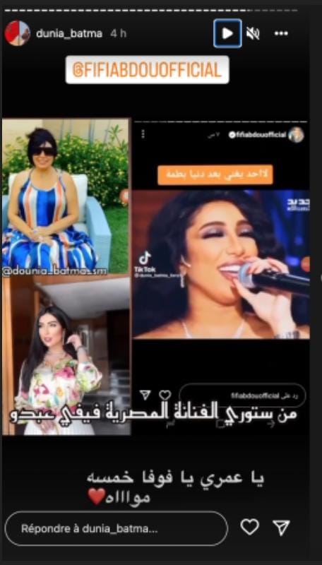 هذا، وقد ردت دنيا باطما هي الأخرى على الفنانة المصرية فيفي عبدو عبر خاصية الستوري بحسابها الشخصي “انستغرام”، حيث نشرت الفيديو ذاته معلقة “من ستوري الفنانة المصرية فيفي عبدو”، مضيفة ” ياعمري يا فوفا، خمسة موااه”.