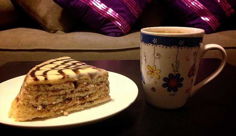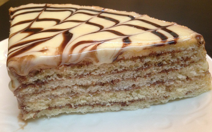 6. و نستمر على هذا المنوال حتى تتكون لدينا 4 طبقات من الكيك + 3 طبقات من الحشوة. طبعاً الطبقة الأخيرة من الكيك لن نضيف فوقها حشوة القرفة