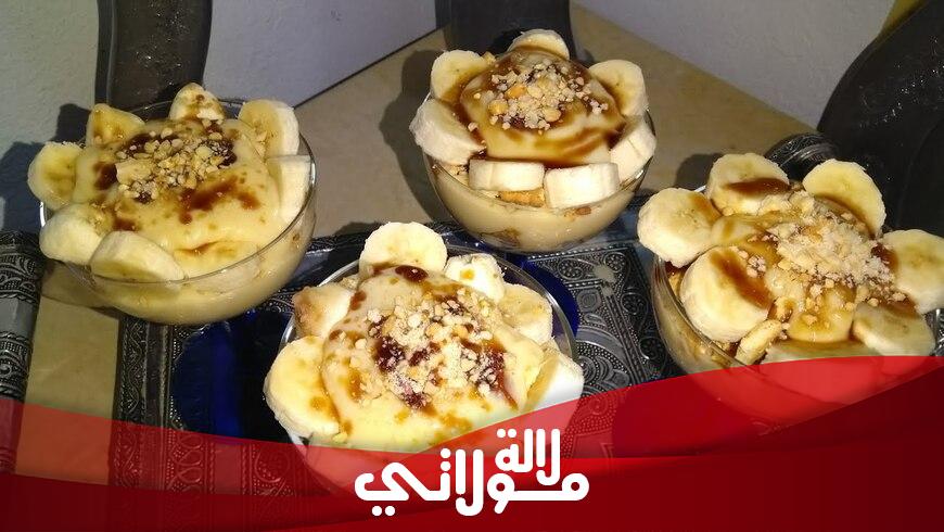 المكونات نصف لتر حليب 50 غ بودرة الكريم شونتيي 60 غ بسكوي علبة فلان كراميل محلى للتزيين موز دوائر لوز مجروش محمر صوص شوكولا.