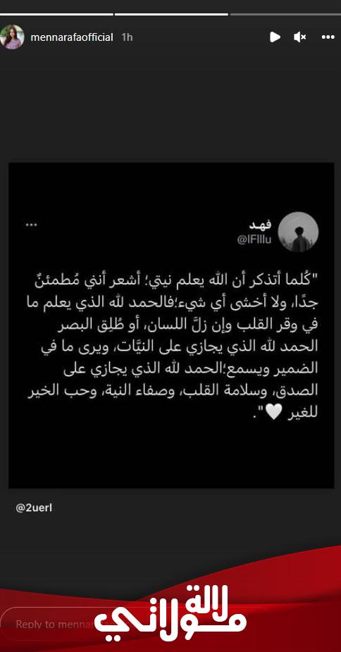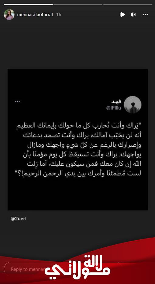 منة عرفة نشرت عبر خاصية الإستوري بحسابها على إنستغرام، رسالتين إلى جمهورها للرد على اتهامها بالخيانة والسطو على ممتلكات زوجها السابق، وقالت في الرسالة الأولى: “يراك الله وأنت تحارب كل ما حولك، بإيمانك العظيم إنه لن يخيب آمالك، يراك وأنت تصمد بدعائك وإصرارك، بالرغم عن كل شيء واجهك وما زال يواجهك، يراك وأنت تستيقظ كل يوم مؤمناً بأن الله معك فمن سيكون عليك، أما زلت لست مطمئناً وأمرك بين يدي الرحمن الرحيم”؟!.