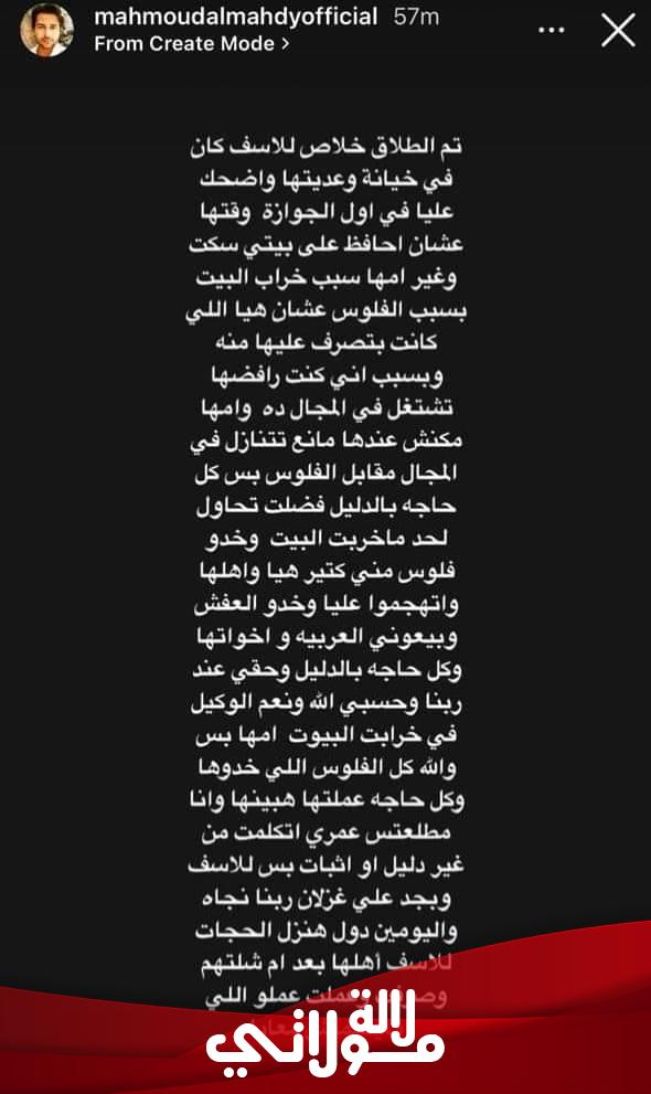وختم المهدي منشوره المطول عبر ستوري إنستغرام: “للأسف أهلها بعد ما شلتهم وصرفت وعملت وعملوا إللي ما يتعملش معايا”.