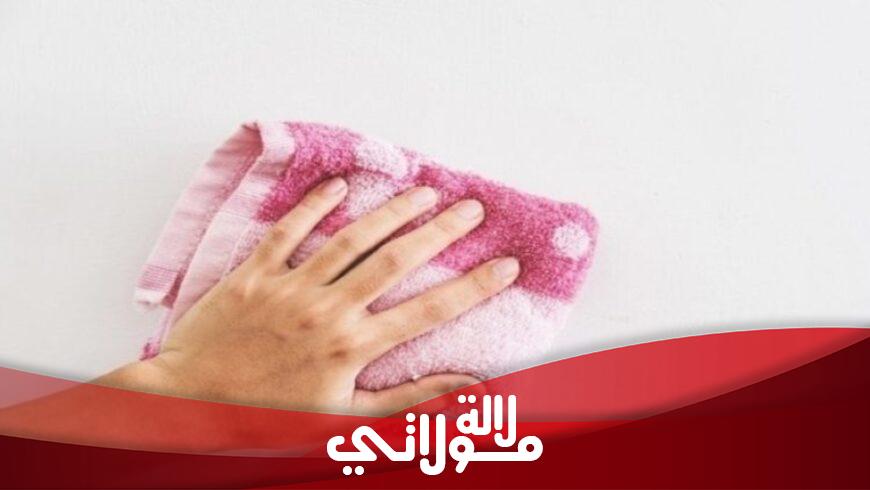 يُمسح الجدار بقماشة للتخلص من البقع السهلة. يُوضع مقدار من مزيل الدهون البودرة على الحائط، على أن يتم مزجه بمقدار من الماء الساخن لفعالية أفضل في تذويب الدهون. يُفرك الحائط باستعمال إسفنجة أو قماشة ناعمة كما يُمكن استعمال فرشاة ناعمة الشعيرات لتنظيف زوايا الجدران، ويجدر بالذكر بأنه يجب تجنب فرك الحائط بقوة؛ لئلا يتم إزالة الطبقة الخارجية من الدهان. يُفرك الحائط بقماشة مغمورة بالماء، ثم يجفف بقماشة جافة، ثمّ يُترك كي يجف.