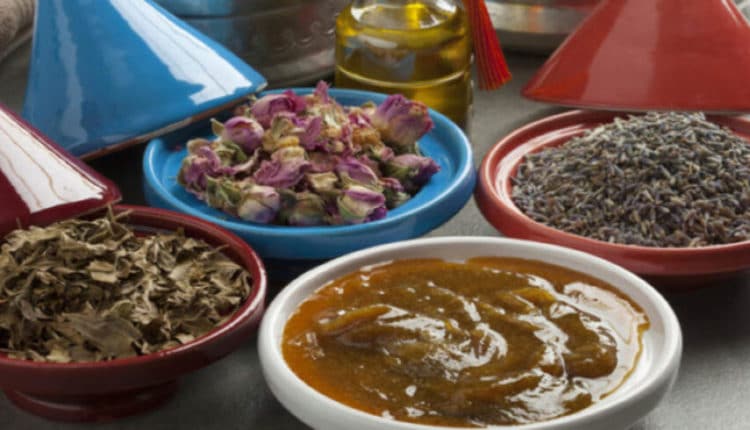 يمكنك سيدتي أن تخلطي ملعقة من الورد الجاف المطحون وملعقة من الحناء الطبيعية المطحونة وملعقة من الخزامى المطحونة وملعقة من القرنفل المطحون وملعقة من الطحالب الخضراء الجافة والمطحونة، وملعقة من البابونج المطحون وملعقة من العرعار المطحون وملعقة من ألزاز المطحون وملعقة السالمية المطحون وملعقة من الغاسول الأخضر واخلطيها بعصير الليمون أو ماء الورد وأضيفي لها ملعقة من الصابون البلدي واطحني الكل في الخلاط ثم طبقي الخلطة على جسمك، واتركيها إلى أن تجف بعدها ادخلي الحمام واستحمي بطريقة عادية سترين أن مع استعمالها لاربع مرات نتيجة مثالية.