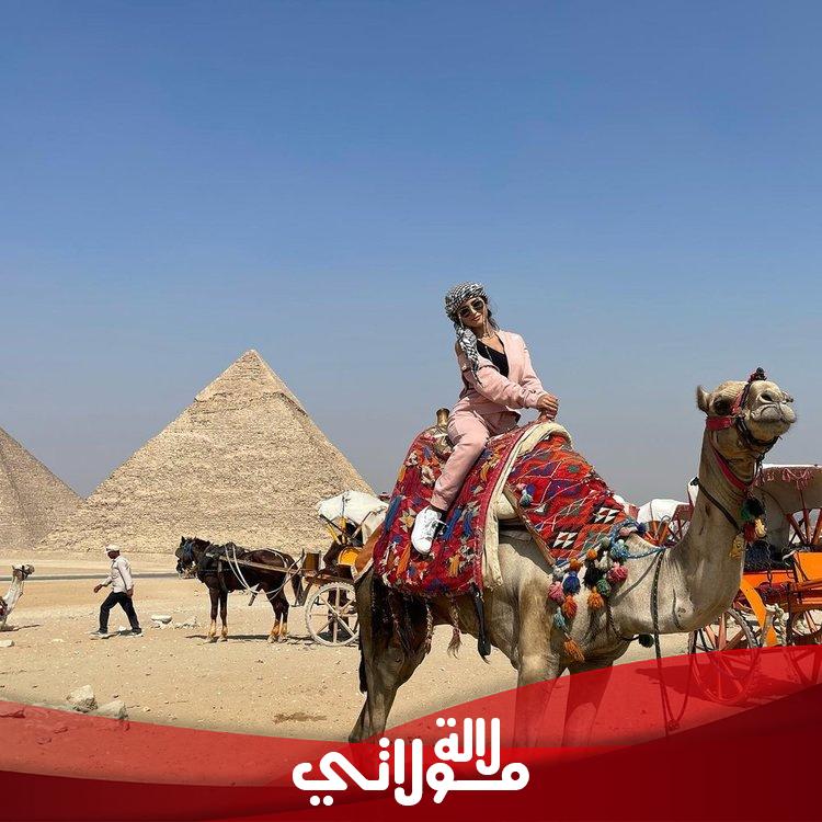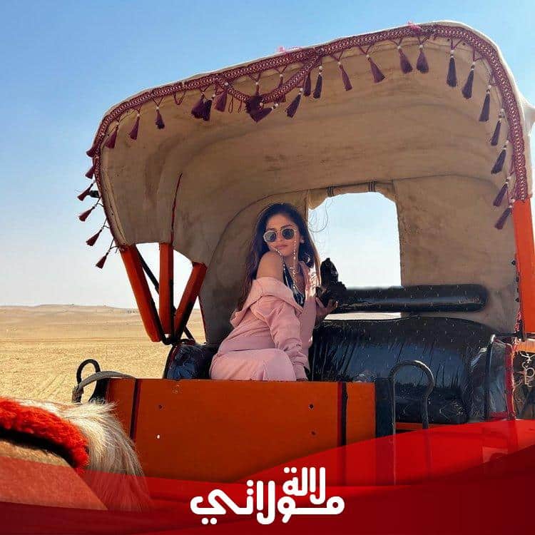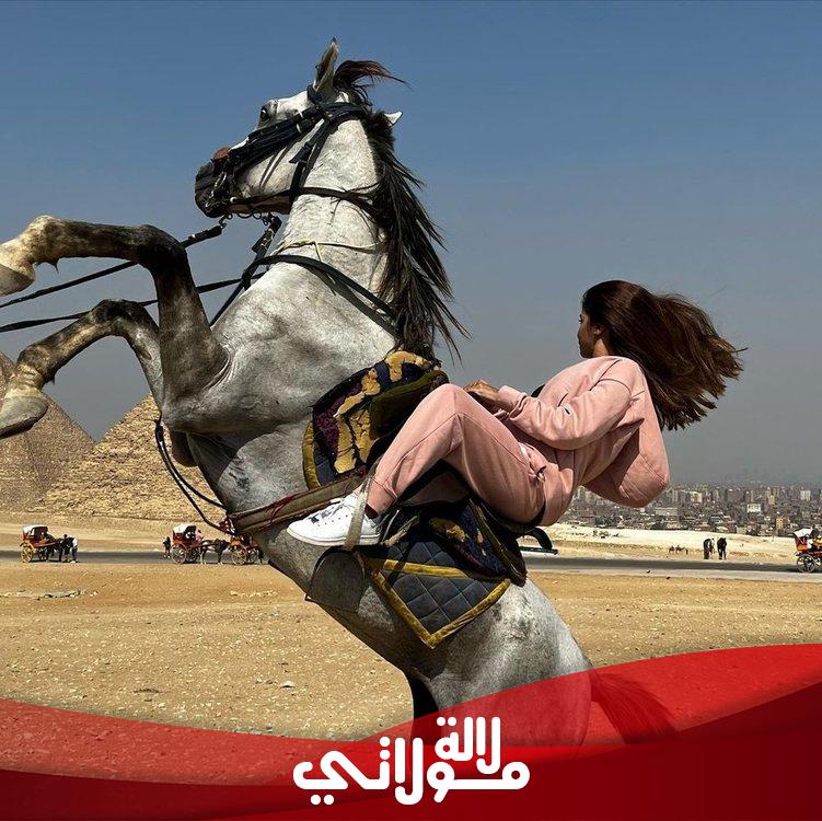 وبدت حلا في الصورة الأولى في عربة تجرها الأحصنة بين الأهرامات والسعادة تغمر ملامحها كما ظهرت في صورة أخرى تركب الجمل بينما ظهرت في الصورت الثالثة تركب حصانا .
