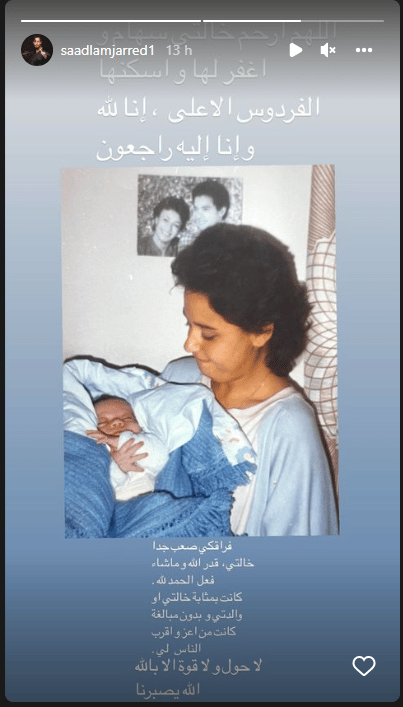 أعلن الفنان المغربي سعد لمجرد عن خبر وفاة خالته سهام، وذلك عبر خاصية الستوري بصفحته الرسمية على موقع التواصل الاجتماعي “انستغرام”.