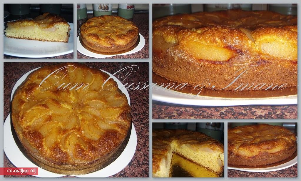 نعمل الخليط في المول مدهون بالزبدة ومرشوش بالدقيق ونستف شرائح الإجاص وندخلها للفران