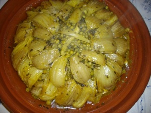 في طاجين نضع اللحم والبصل والزيت والتوابل والقزبر والمعدنوس نترك الكل فوق نار هادئة حتى تأخذ البصل اللون الذهبي بعدها نظيف الثوم والماء ونترك الكل لمدة نصف ساعة، بعدها نظيف الجلبانة والقزبر والمعدنوس والبسباس مقطع ثم نتركها 45 دقيقة تقريباً إلى أن يجهز المرق ونقدم الطاجين بالصحة والراحة.