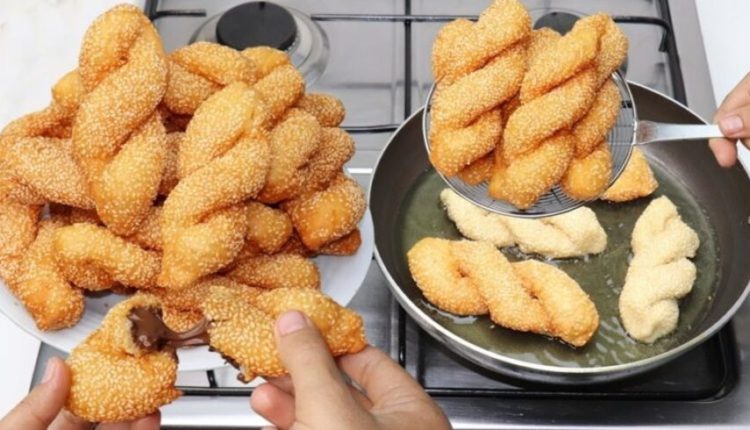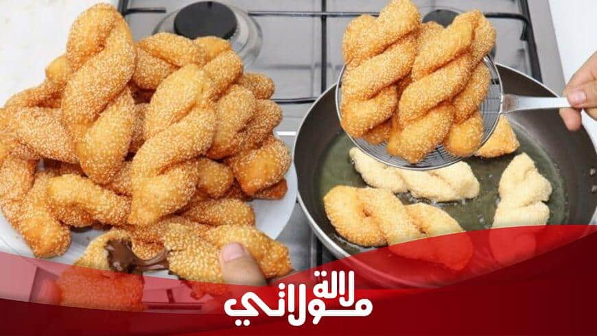 المقادير: كأسين و نصف حليب 375ML 7 كؤوس دقيق = 700G ملعقة زيت نباتية ملعقة كبيرتين خل ملعقة كبيرة سكر ملعقة كبيرة من خميرة الخبز ملعقة صغيرة ملح شولاطة الدهن سمسم أو جانجلان أبيض زيت للقلي التزيين حسب الرغبة.