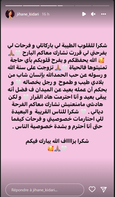 وتابعت: “هادشي مامنعنيش نشارك معاكم الفرحة ديالي شكرا للناس القريبة والبعيدة للي احتارمات خصوصيتي وفرحات كيفما حتى أنا احترم خصوصية الناس”.