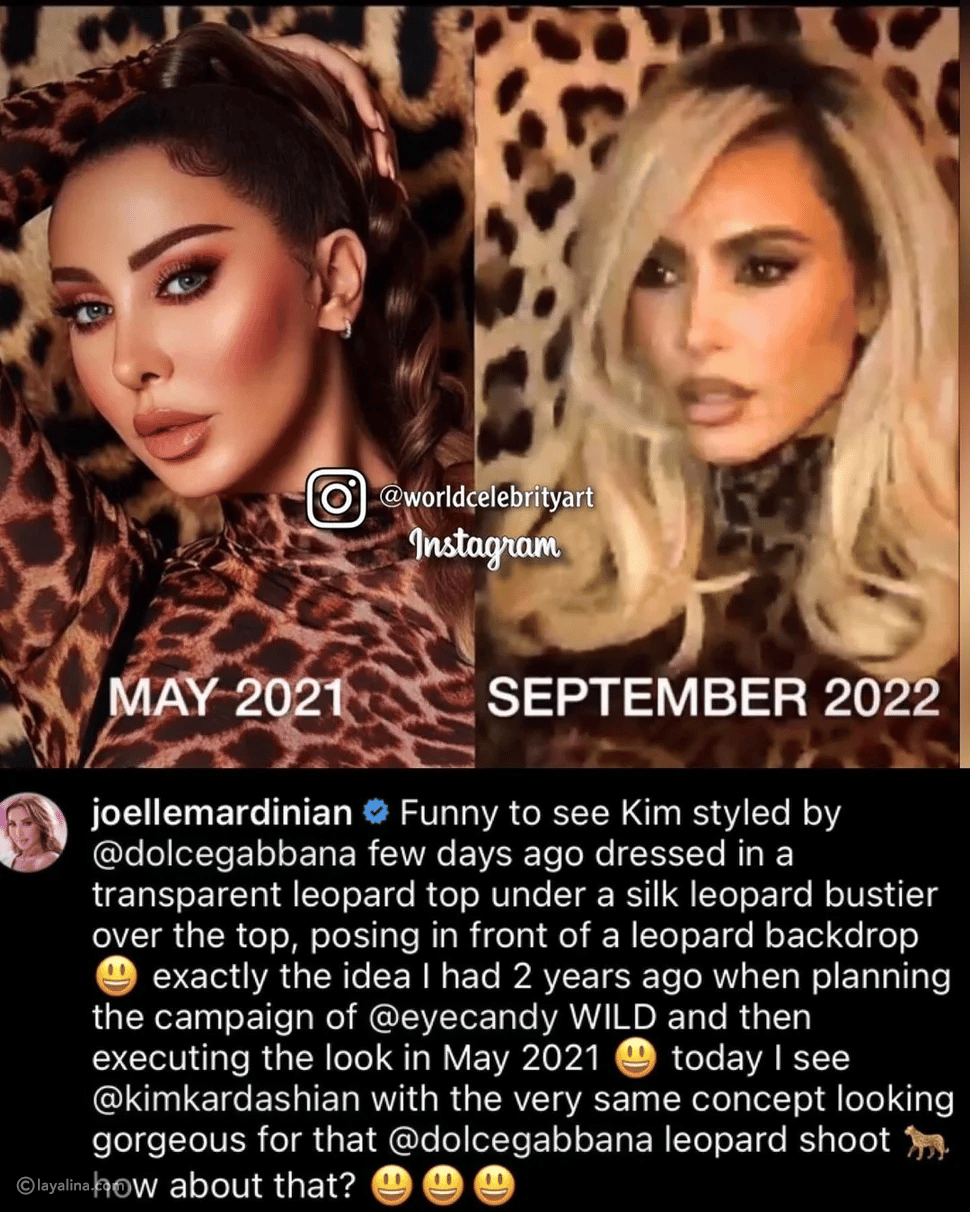 وتابعت كلامها مشيرة أنها عملت على نفس الفكرة قبل عامين قائلة: ” بالضبط الفكرة التي كانت لدي قبل عامين عند التخطيط لحملة eyecandy WILD ثم نفذت المظهر في أيار/مايو 2021 اليوم أرى كيم كارداشيان بنفس اللوك الذي يبدو رائعا عليها”.