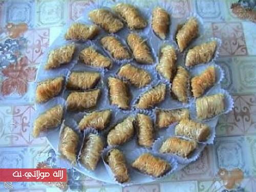نآخد عقدة لوز ونعمل بها قضبان متوسطة طول حتى يسهل تحكم بها تلف عليها سميطات ورقة وتسقى بزبدة مذابة وتقطع مثل صورة تطهى في فرن متوسط . ثم تسقى بعسل ساخنة