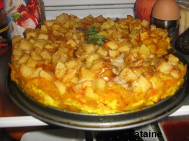 ملي نحسوا صوص ديالنا تخترات يعني اندامجت مزيان انا كنحولها لمول ديال الكيك ونخويها فيه ثم كنغطيها بالبطاطس مربعات المقلية ونصب عليهم البيض وندخله الفرن حتى يطيب البيض