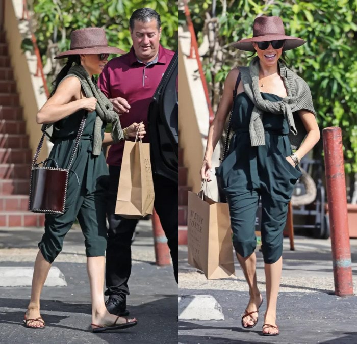 وظهرت ميغان بإطلالة لافتة للغاية، إذ تألقت خلالها برومبير أخضر دون حمالات كتف، إلى جانب سترة زيتونية اللون، قبعة رأس بنية كبيرة الحجم، نظارة شمس وصندل.