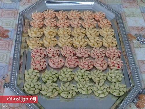 عقدة لوز( 500 غ لوز مصلوق مقشر ومطحون مع 250 غ سكر سنيدة + قبصة مسكة حرة + 2 ملاعق كبيرة ماء زهر+ نصف كاس صغير زبدة مذابة ) يخلط كل جيدا وتقسم إلى 3 أقسام كل واحدة يضاف لها ملون غذائي مختلف ( أحمر- أخضر- أصفر) وتعمل منها حرابل صغيرة .