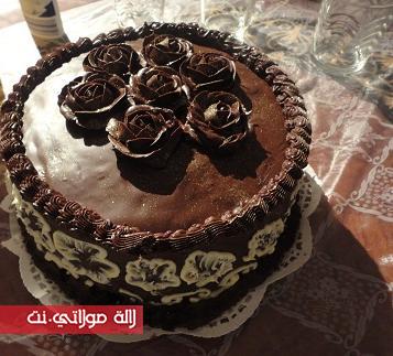 من بعد درت كناش ديال الشكلاط و ضفت عليه شويش ديال الشكلاط بني و غطيت به الطورطة , و نفس الكناش درت به وريدات باش زينتها , و دوبت الشكلاط الابيض و رسمت به وريدات على جناب الطورطة و بشيتة بديت كنجر من طراف الوريدة