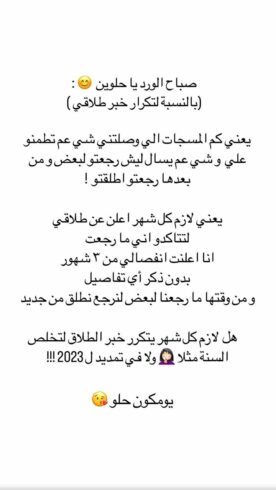 وكتبت نسرين طافش في تدوينتها: “صباح الورد يا حلوين، بالنسبة لتكرار خبر طلاقي، يعني كم المسجات اللي وصلتني شي عم تطمنوا عليّ وشي عم يسأل ليش رجعتوا لبعض ومن بعدها رجعتوا اطلقتوا.. يعني لازم كل شهر أعلن عن طلاقي لتتأكدوا إني ما رجعت!”.