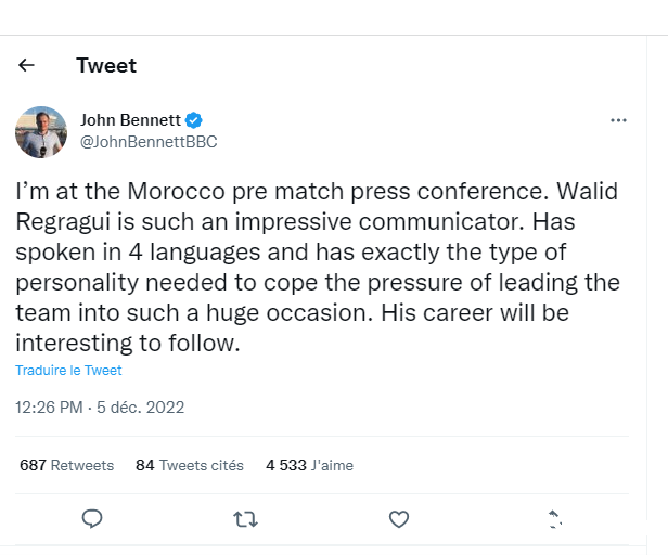عبر جون بينيت، مذيع بقناة BBC SPORT، عن إعجابه بمدرب المنتخب المغربي وليد الركراكي، وذلك بعد حضوره للندوة الصحفية التي عقدها اليوم الاثنين 5 دجنبر 2022، للحديث عن مباراة المغرب وإسبانيا المقررة غدا الثلاثاء، ضمن ثمن نهائي كأس العالم في قطر.
