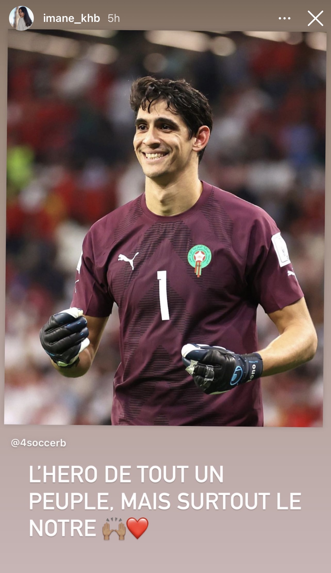 وكانت ايمان زوجة حارس المرمى ياسين بونو الذي خلق الحدث امس بما قام به من عمل وانجاز عظيم وتاريخي، من بين المباركين له حيث نشرت عبر