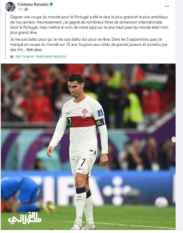 وكتب رونالدو، رسالة عبر صفحته الرسمية بموقع فيس بوك قائلا: كان الفوز بكأس العالم للبرتغال أكبر وأكثر حلم طموحا في مسيرتي المهنية.. لحسن الحظ فزت بالعديد من الألقاب الدولية وأيضا مع منتخب البرتغال، لكن وضع اسم بلدنا على أعلى قدم في العالم كان أكبر أحلامي.قاتلت من أجل البرتغال.. حاربت بشدة من أجل هذا الحلم.. في 5 مرات سجلتها في كأس العالم على مدار 16 عاما، دائما بجانب اللاعبين العظماء وبدعم من الملايين من البرتغاليين، قدمت كل ما لدي. أترك كل شيء خارج الملعب. لم أدر وجهي أبدًا للقتال ولم أتخلى أبدًا عن ذلك الحلم”.