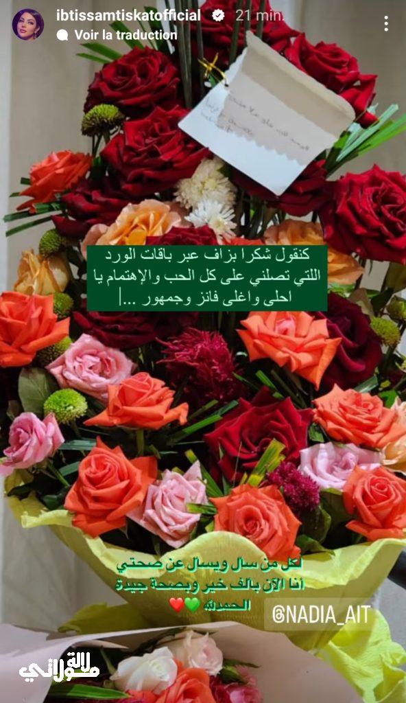 وعلقت تسكت على الصورة بمايلي: “كنقول شكرا بزاف عبؤ باقات الورد التي تصلني على كل الحب والإهتمام يا أحلى وأغلى فانز وجمهور..”.