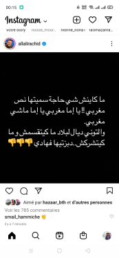 ونشر رشيد العلالي تدوينة عبر حسابه الرسمي على موقع تبادل الصور والفيديوهات انستغرام، كتب فيها قائلا:”مكاينش شي حاجة سميتها نص مغربي يا اما مغربي يا اما ماشي مغربي، والتوني ديال البلاد مكتقسمش ومكيتشركش دبزتيها فهادي”.