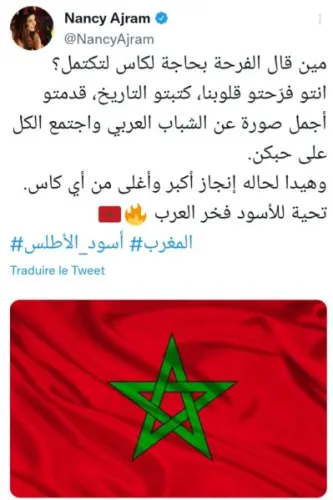 تفاعلت الفنانة اللبنانية نانسي عجرم مع خسارة المنتخب المغربي ضد نظيره الفرنسي، في دور نصف نهائي كأس العالم قطر 2022، أول أمس الأربعاء.