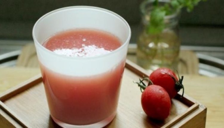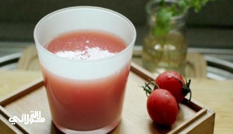 المكونات : حبتين من الطماطم + حبة من الخيار + عودين من الكرفس + نصف كوب من عصير الليمون + قطعة طرية من الزنجبيل + عصير البرتقال + ملعقة من العسل الطبيعي + ملعقة من الزبيب