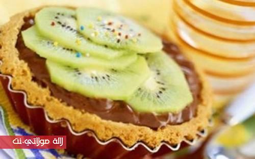 قشري حبات الكيوي وقطعيها إلى دوائر وحين موعد التقديم زيني القوالب بالكيوي ورشي فيرميسال الشكولاطة.