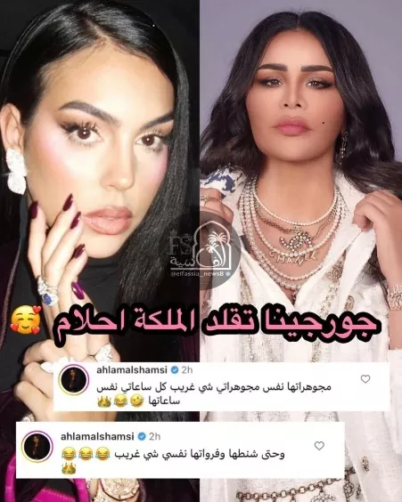 حيث أشارت أحلام بطريقة غير مباشرة في تعليق لها على صورة لجورجينا رودريغيز ظهرت بها وهي تستعرض مجوهراتها الباهظة إلى أن الأخيرة تقوم بتقليدها فيما ترتديه من مجوهرات أو ساعات وحقائب وغيرها .