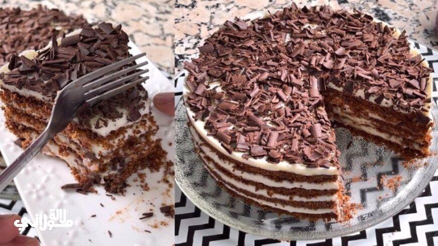 مكونات البسكوي: علبة ونصف من البسكويت 300غرام 60غرام من العنب المجفف (زبيب) 60غرام من الجوز(كركاع) ملعقتين كبيرتين من الزبدة 60غرام 120غرام من الشكلاطة طبقة الكريمة : نصف لتر من الحليب كأس الا ربع من السكر 150غرام 4ملاعق كبار من الدقيق 80غرام ملعقة صغيرة من الزبدة 15غرام 2اكياس من السكر الفانيليا علبة من الكريمة السائلة200مل( أو ياغورت) شكلاطة مبشور لتزين.