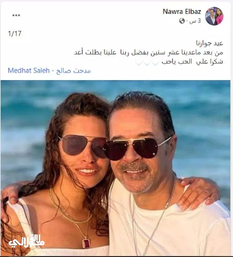 نشرت نورا الباز صورة تجمعها بزوجها مدحت صالح في أحدث ظهور لها في منشور لها عبر حسابها على موقع التواصل الاجتماعي “فيس بوك” .