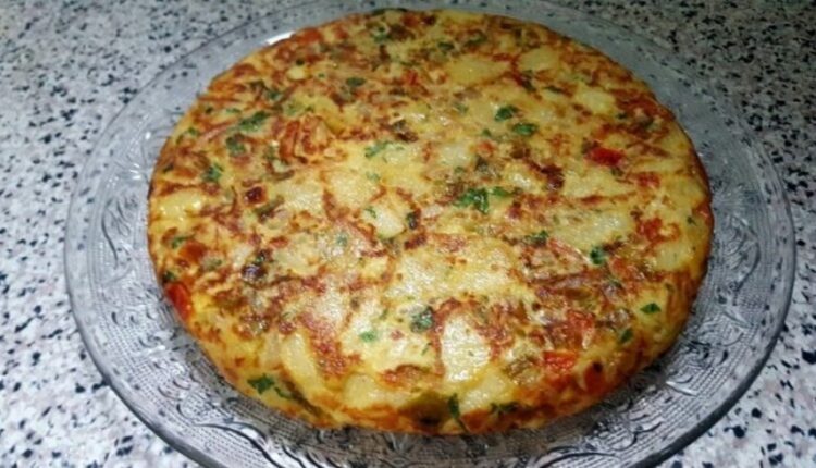 المقادير: ½ كيلو (500 جم) بطاطس متوسطة الحجم. ثمرة بصل متوسطة الحجم+كوب (250 مل) زيت زيتون+6 بيضات كبيرة+ ملح وفلفل أسود.